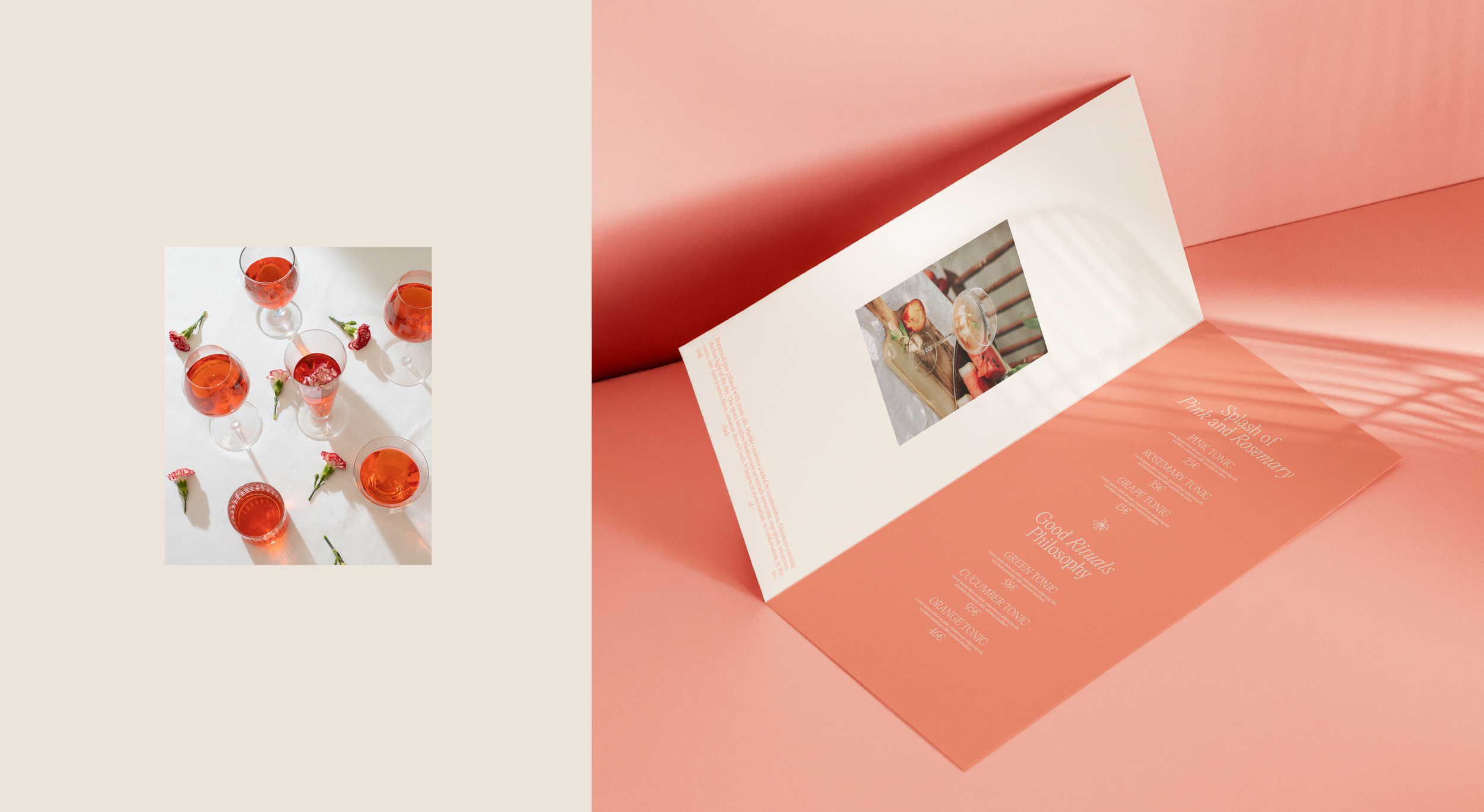 From logo to menu and packaging, every detail was designed to evoke atmosphere, where citrus, herbs and golden hour light shape the experience as much as the drink itself.